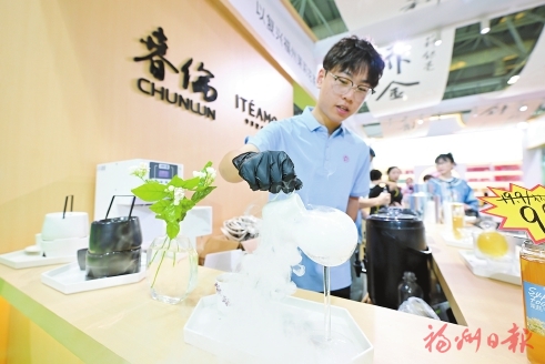 今年茶交会上,工作人员冲泡“晓梦蝶”新式茶饮。记者 石美祥 摄