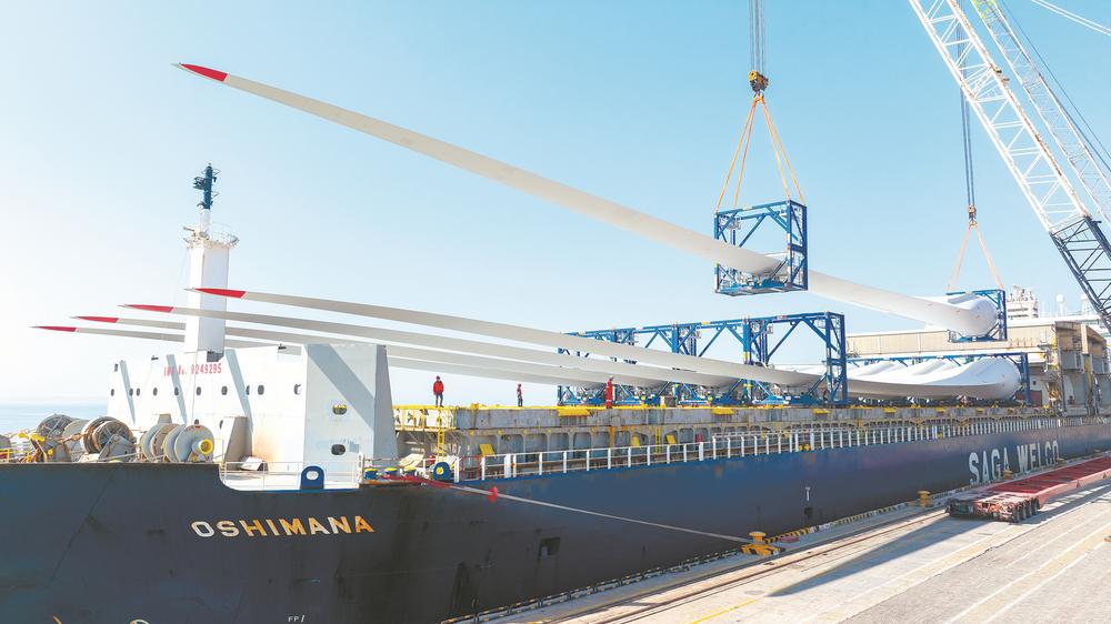 15日,8片长达107米的超长风电叶片在福州港江阴港区被逐一吊装至“欧斯玛纳”轮(如图),在福州海关所属榕城海关监管下启程远赴英国,“乘风”出海。这是今年福州港首趟风电叶片出口。