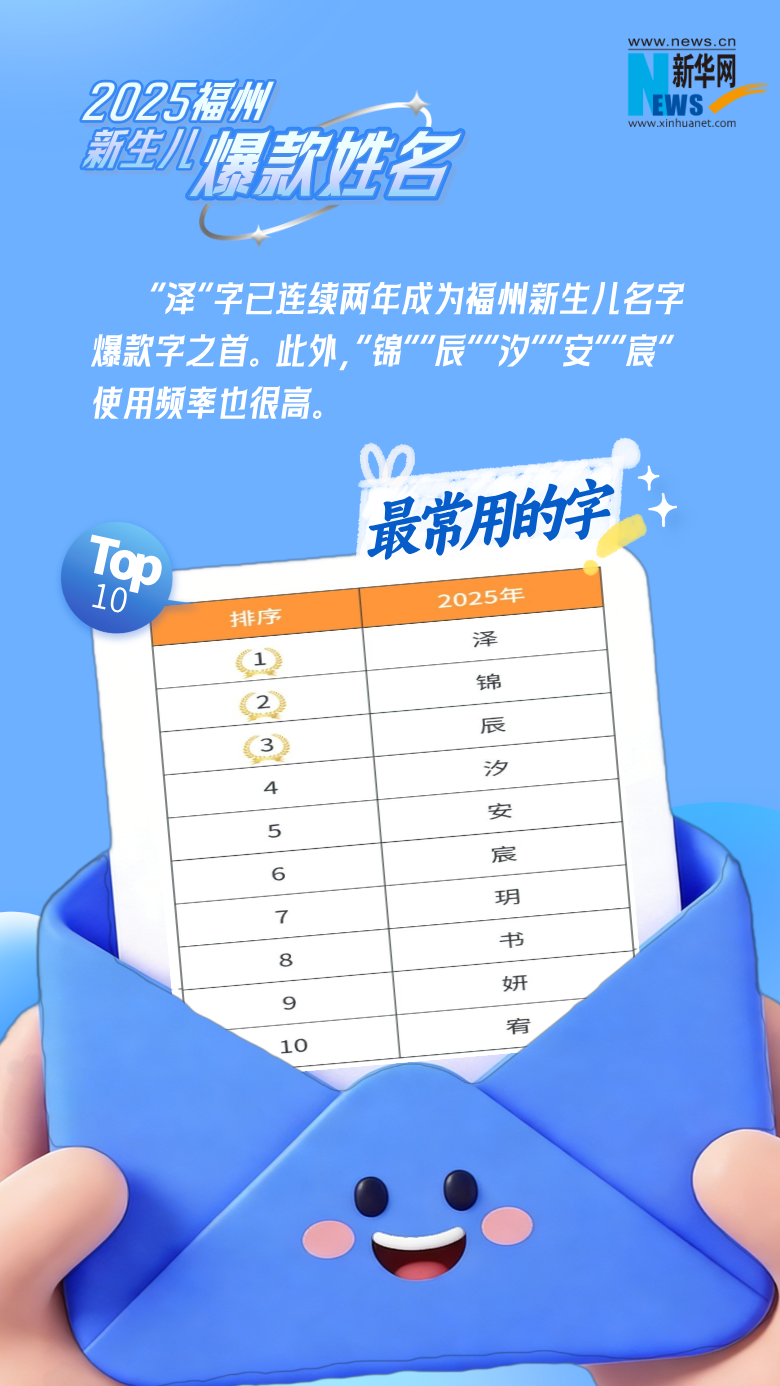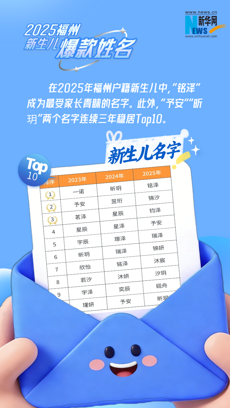 新华网福州1月16日电(刘丰)“铭泽”“锦汐”“钧泽”“予安”“瑞泽”……这些名字里,有你熟悉的吗?1月16日,福州市公安局发布2025年福州新生儿爆款姓名。