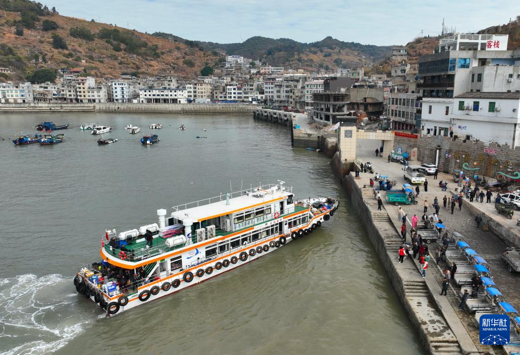 1月26日,载着快递邮件的客货邮融合班船停靠在霞浦县海岛乡的西洋岛码头。新华社记者 林善传 摄