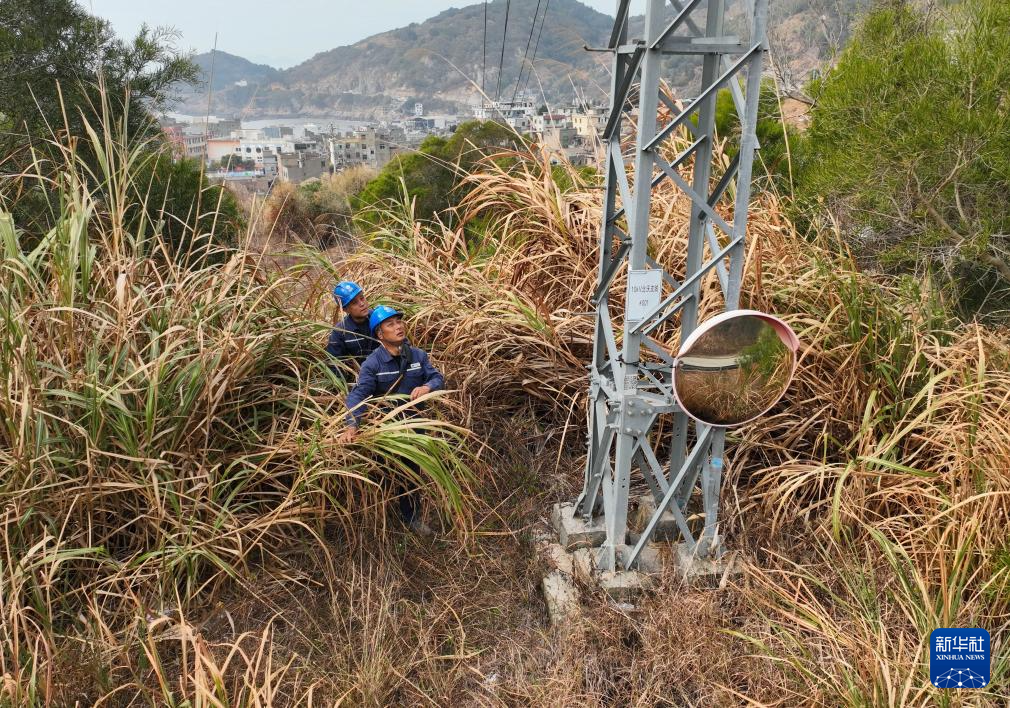 1月26日,刘江平(前)和同事蒋立云在霞浦县海岛乡北澳村进行线路巡查(无人机照片)。新华社记者 林善传 摄