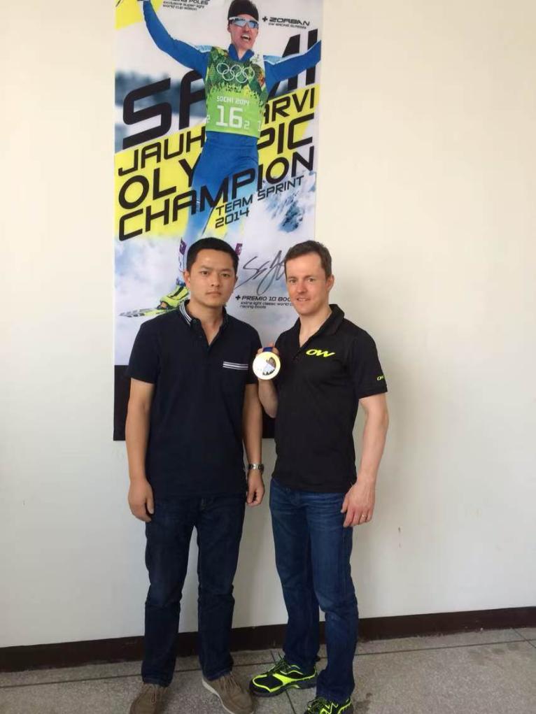 厦门彼尔纤维制品有限公司总经理张雄辉(左)与芬兰冬奥冠军乔霍贾维(右)在公司合影。受访者供图