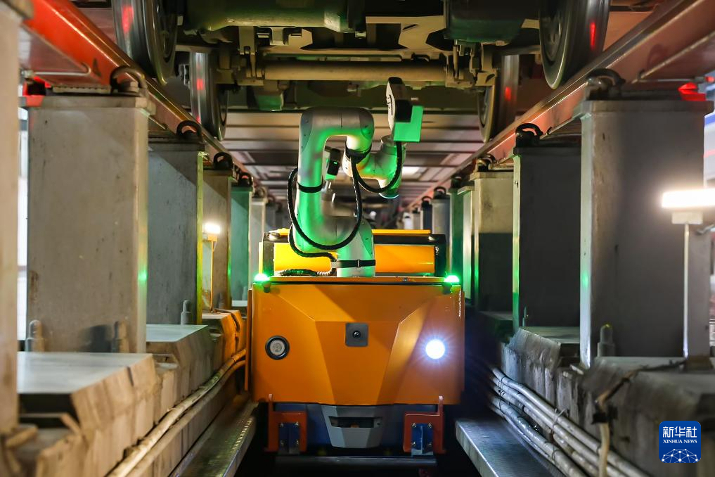 福州南动车所检修库内,动车组检测机器人正在作业。新华社发(张成伟 摄)