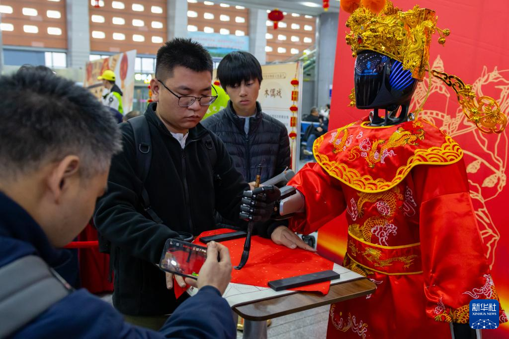 泉州站候车大厅内,机器人现场为乘客书写“福”字。新华社发(李舜 摄)