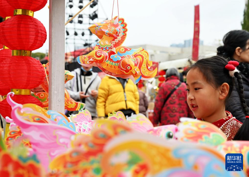 2月17日,小朋友在年货市集观赏花灯工艺品。
