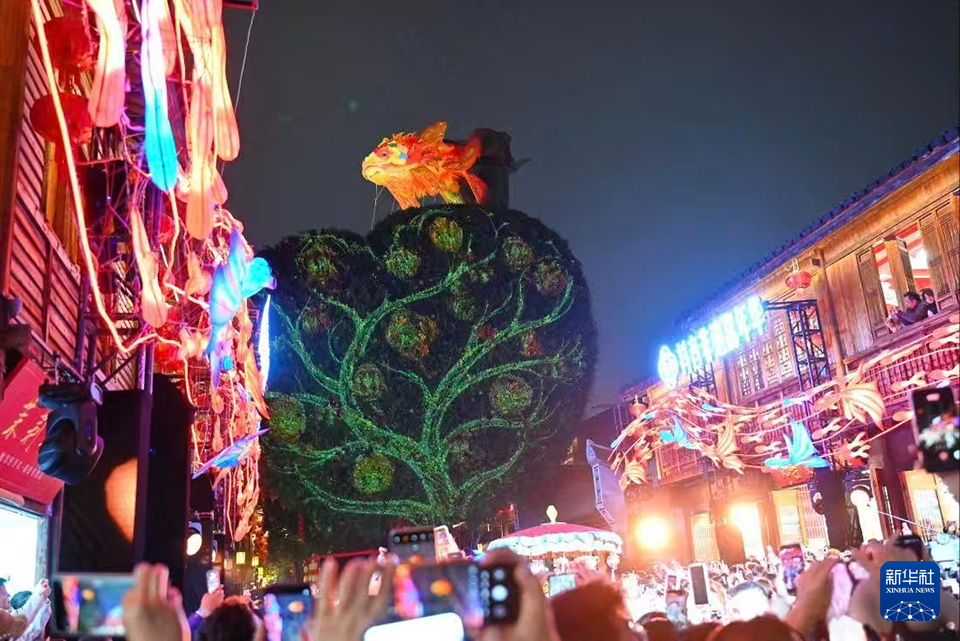3月3日,福州三坊七巷南后街爱心树上的投影秀和空中漂浮的“福鱼”吸引了众多的市民游客拍照。新华社记者 林善传 摄