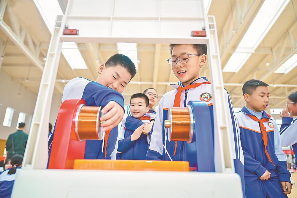 场地中央,伴随着动感音乐,机器人列队起舞。舞台之上,《干冰液氮秀》《马德堡半球》等科普实验轮番上演,辅导员们用生动有趣的表演,让抽象的科学原理看得见、摸得着。台下,孩子们掌声不断。