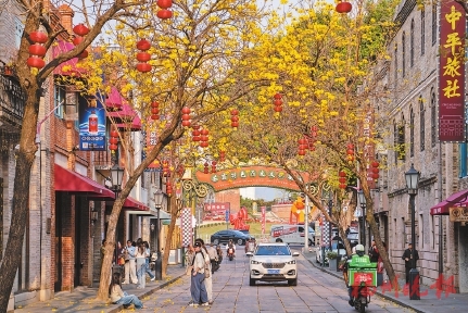 福州春天的美,不仅在于满目苍翠,还在于处处皆景的盎然生机,散落全城的花事盛宴正悄然上演。乌山的樱花与桃花漫山铺陈;三角梅在三坊七巷的马鞍墙上攀爬;上下杭景区里白墙上伸出的黄花风铃木摇曳多姿……这些共同织就了福州的“高颜值”春天。